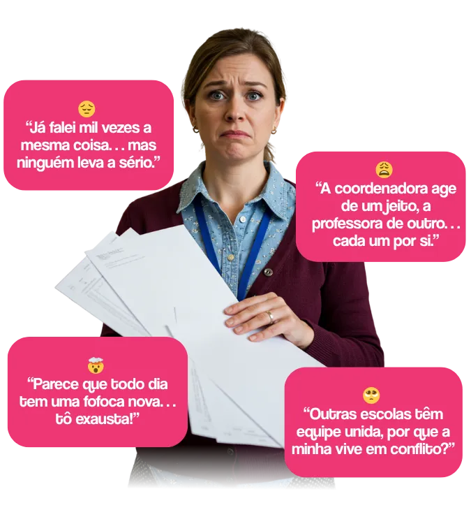 Tudo aqui foi testado com escolas reais, que conseguiram transformar confusão em direção — e equipe desorganizada em time unido.